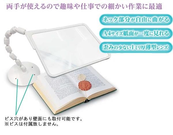 A4サイズ紙面が一度に見えるワイドフレームのルーペです。スタンド付きなので置き型にもビスでの壁付けにも出来ます。スタンドのネック部分は背骨のように曲がり、360度調節が可能です。両手が空くので読書はもちろん、手作業にも最適☆ |