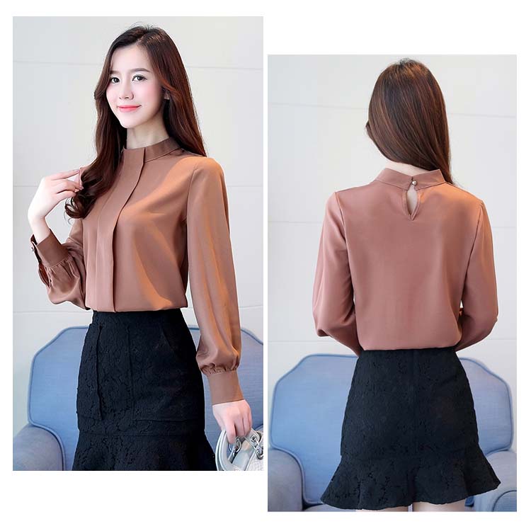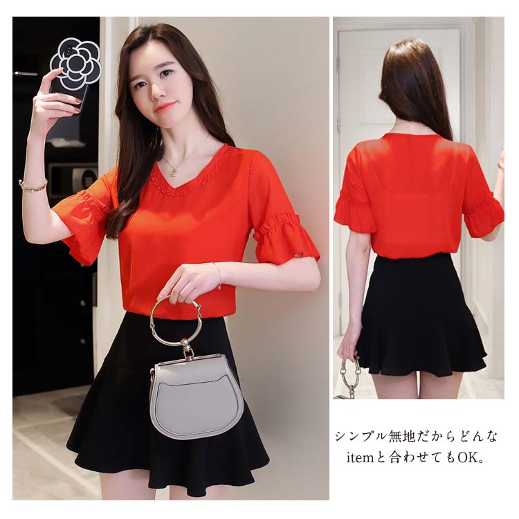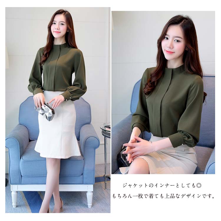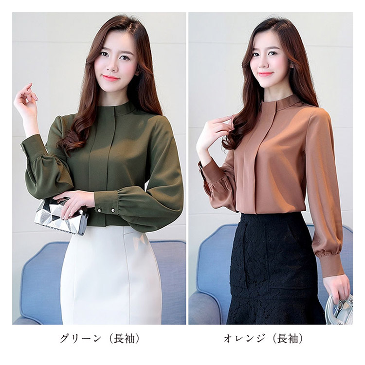 | ふんわりシフォン素材がとびきりフェミニンなブラウスに注目。柔らかくて透け感のあるシフォン素材を使用し、ぐっと女性らしい印象にすっきりとしたスタンドカラーが女性らしさを惹き立てる一着。シンプル無地だからどんなitemと合わせてもOK。ジャケットのインナーとしても◎もちろん一枚で着ても上品なデザインです。さらりとした着心地で、春や秋、夏にも涼しく着まわせる便利な1着です。 | |