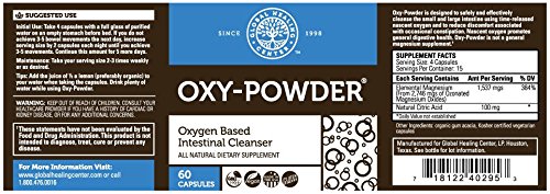 -. Binding : Health and Beauty -. Brand : Global Healing -. EAN : 0604135254811 -. Feature : Oxy-Powder® is the best rated, scientifically formulated, all natural oxygen colon cleanser that safely relieves the bloating, irritation and constipation associated with a toxic colon. / Oxy-Powder® is designed to clean the entire 25 to 30 feet of the digestive tract and oxidize and reduce the amount of hard impacted fecal matter. Other cleansers stimulate mucous production in the colon rather than breaking down hard fecal matter. / Oxy-Powder® contains a unique combination of ozone-oxygenated magnesium and citric acid, not harmful herbs which can damage the delicate intestinal lining. / Oxy-Powder® is carefully made in the USA under strict quality controls and processing. / The active ingredients in Oxy-Powder® are clinically proven safe and effective for IBS. -. IsAdultProduct : 0 -. Label : usa -. Manufacturer : usa -. MPN : tx -. PackageQuantity : 1 -. PartNumber : tx -. ProductGroup : Health and Beauty -. ProductTypeName : HEALTH_PERSONAL_CARE -. Publisher : usa -. Studio : usa -. Title : Colon Cleanser & Natural Laxative Overnight Constipation Relief Pills#Oxy-Powder® -. UPC : 604135254811