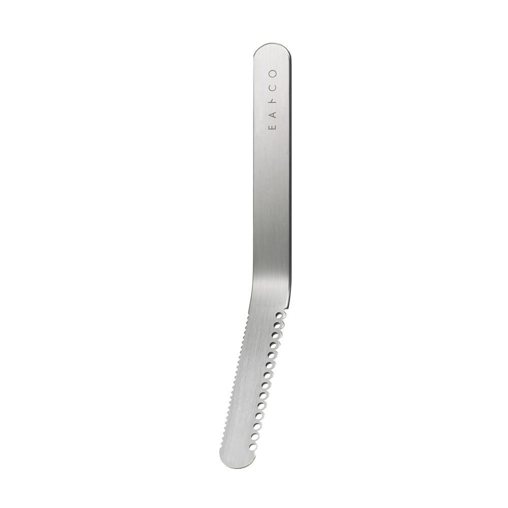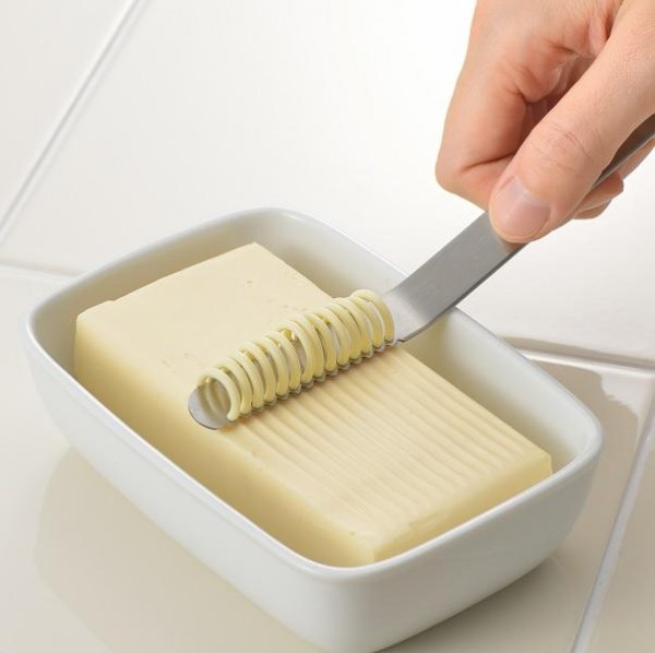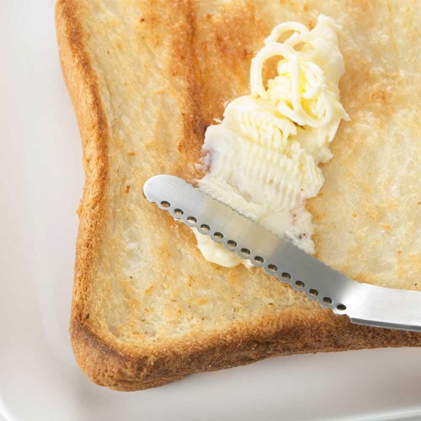 固いバターを糸状にけずり、ふんわり濡れるバターナイフ。ギザ刃部分はコゲ落としとして。