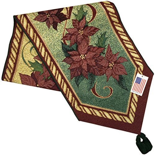 - Manual Christmas Flower Poinsettia Ribbon Bordered Woven Tapestry Tablerunner in shades of red, green, yellow and gold, hemmed edges with tassel on each end