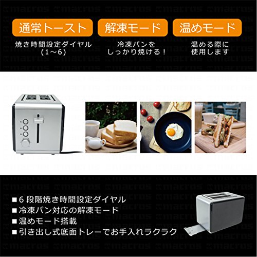 ●3모드 업토스터●≪특징≫●통상 토스트/해동 모드/따뜻하게 모드 탑재.●심플 자인의 다기능토스터●≪사양≫●치수:약W26×D16×H18cm●코드:약85cm●중량:약1.1kg●재질:PC 아연 도금 ABS●전원 방식:교류식●정격전압:100V●정격주파수:50/60Hz●정격소비전력:700W●대응 두께:4매 잘라(약30mm)까지