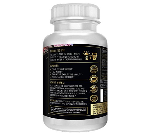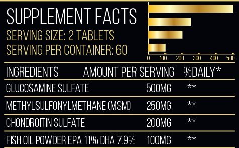 Product features The only 4-in-1 Joint Relief Product Proven in published clinical trials to be highly effective in relieving the symptoms of osteoarthritis, back pain, joint pain Decreases stiffness, maintains healthy structure and function of cartilage in your joints Helps rebuild torn cartilage and significantly improves overall joint performance Utilizes Pharmaceutical grade Glucosamine, Chrondrotin, MSM, Fish Oil (with DHA, EPA, and Omega 3,6,9) Made in USA in FDA-approved cGMP facility Ingredients Per serving:500mg Glucosamine, 250mg MSM, 200mg Chondroitin sulfate, 100mg Natural Fish oil