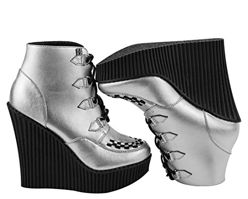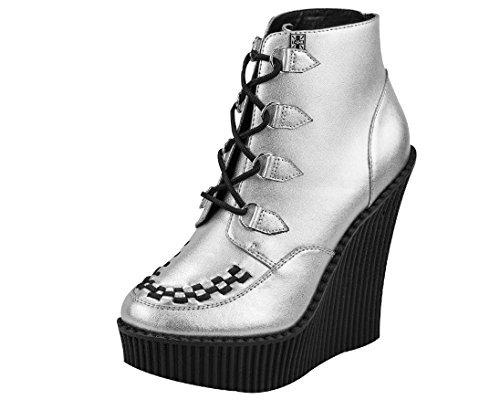 Studio : T.U.K. Publisher : T.U.K. Binding : Apparel Product Description Last few left! Get them before they're gone for good! With these shiny silver T.U.K. Creeper Wedge Booties on your feet you'll be everyone's fun ADD distraction. The silver metallic leather upper features petite d-ring tabs and silver metal d-rings with black laces for tying up. The black interlace on the front give these wedges the classic creeper look. The bootie upper is about 4 ? inches high, finishing right above the ankle. The ridged PU sole is lightweight and the height ranges from about 5 1/4 inches in the back to 1 1/4 inches in the front. 0