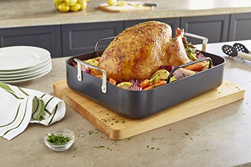 Our reliable, heat responsive 3mm thick forged aluminum roaster is cured through a hard-anodized process. This technique ensures faster heating and more evenly cooked meals. It is durable, non-stick, rust and corrosion resistant and cleans easy. Plus, it sports a 16x13x3 mega capacity, so turkey time is anytime.