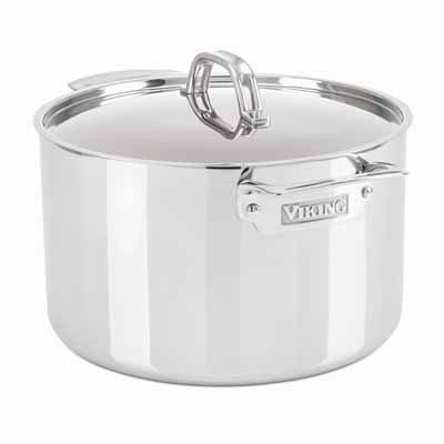 The 3-Ply Stainless Steel Viking 12 quart. Stockpot helps to achieve rolling boils in a shorter time than conventional stockpots due to the clad construction throughout the vessel. The 3-Ply Stainless Steel build allows the side of the vessel to transfer energy from the side walls as well as the bottom so that more of the pot is working to distribute heat quickly and evenly. Beautifully polished to a mirror finish the Viking stockpot is constructed with a three layers of metal - the exterior layer is a magnetic 18/0 stainless steel making this pot compatible with induction stovetops as well as gas, electric and ceramic. The next layer is an aluminum alloy to evenly and efficiently distribute the heat throughout the pot. The inner cooking layer is 18/8 surgical stainless steel that is easy to clean and non-reactive, making it an excellent surface for preparing acidic foods such as tomato based sauces. The combination of materials increases the heat transfer throughout the pan, making more efficient for cooking. The large capacity of the stockpot is ideal for preparing pastas, soups, stocks and more. The vessel's high walls minimize evaporation, making it ideal for slow simmering techniques. The Viking signature handles are mounted to the vessel with solid stainless steel rivets and are designed for easy grip even with a towel or oven mitt. Compatible with all stove types, the Viking stockpot is oven and grill friendly up to 600 degrees Fahrenheit. The Viking 3-Ply Stainless Steel 12 quart Stockpot is backed by a limited lifetime warranty. Dishwasher safe.Feature