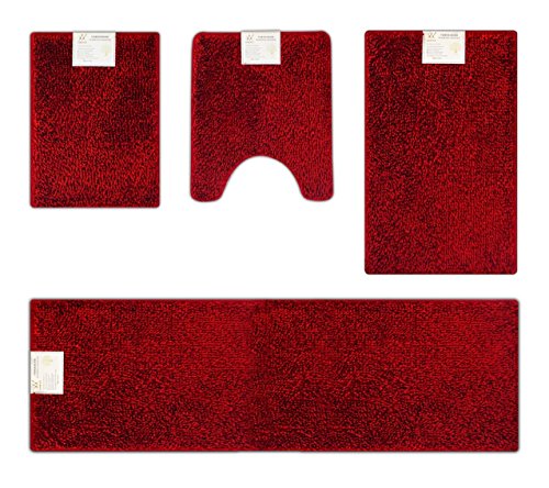 Verxii Home Luxury No-Slip Soft Shaggy Bath Floor Mat Set Multiple Choice (4 Pcs Combo, Bright Red)