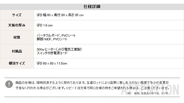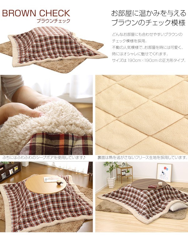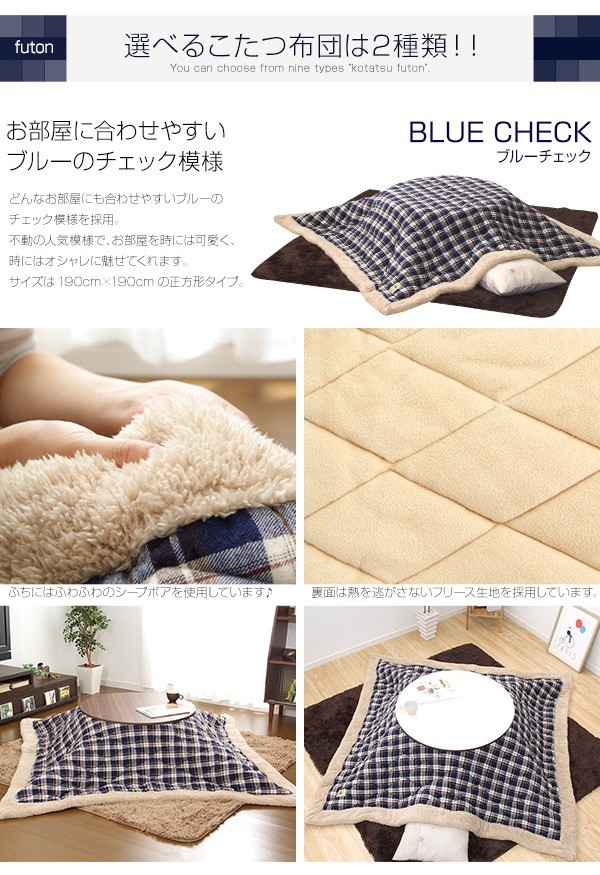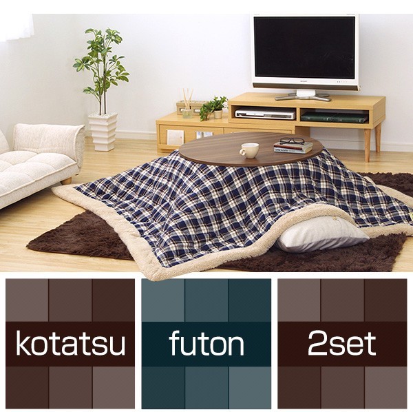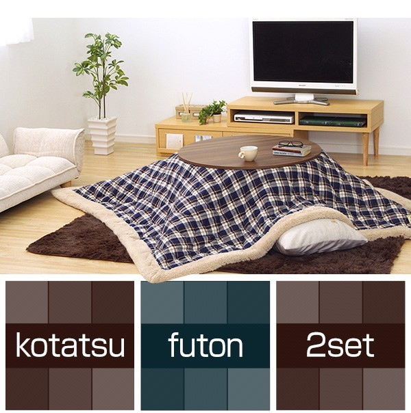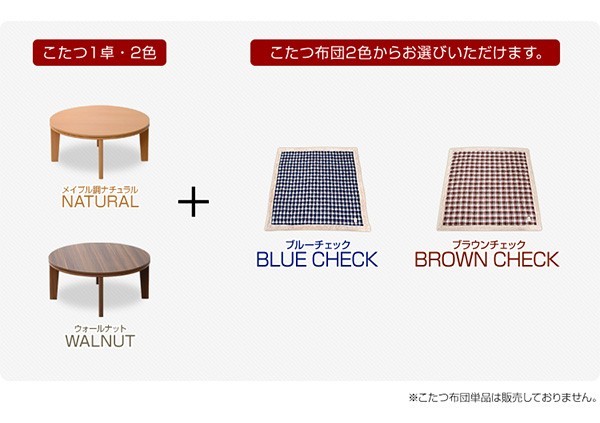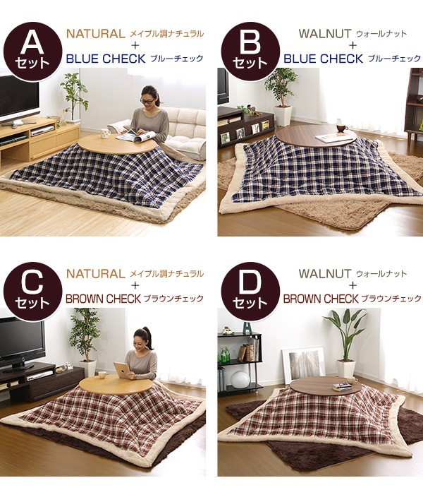 【商品について】チェック柄こたつ布団×こたつテーブル2色から選べる!【カジュアルこたつ2点セット(丸型・80cm幅)】■サイズ:本体外寸:(約)幅80x奥行80x高さ35cm(約)16.5kg布団:(約)幅190x奥行190cm(約)3kg■カラー:Aセット Bセット Cセット Dセット■素材:(こたつ本体)天板:パーチクルボード、PVCシート 脚:MDF、PVCシート※付属品:300Wヒーター(メトロ電気工業製)スイッチ付き電源コード(こたつ布団) キルティング製品表側:ポリエステル50%、アクリル30%、その他20%裏側:ポリエステル100%■その他:完成品でお届けします。※脚はお客様取付け梱包サイズ:本体:(約)83x83x11.5cm(約)17.5kg布団:(約)55x45x25cm(約)4kg