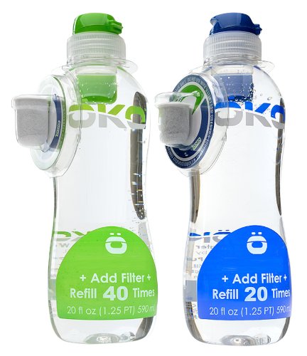 OKOPURE tap water filtration bottle saves 98% on bottled water plastic waste when you use it for 40 refills. You get fresh, crisp and clean water each time. Simply recycle the bottle after 40 uses. OKOPURE uses natural fine coconut shell carbon filtration which meets NSF standard 42 for reduction of chlorine, taste and odor from municipal water. It is lightweight, looks great and well balanced. Bottle includes a sports cap and refill counter to keep track of use. Drink safe water and in style with OKOPURE. Colors will vary.Feature