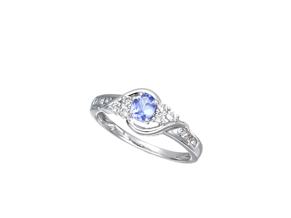 White gold ring featuring oval-cut tanzanite bordered in small white topaz stones and nestled in overlapping bands