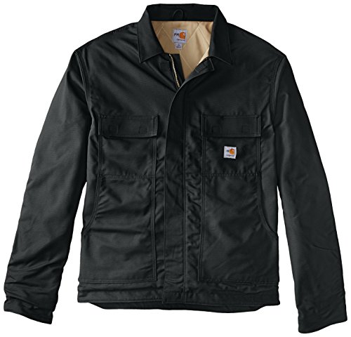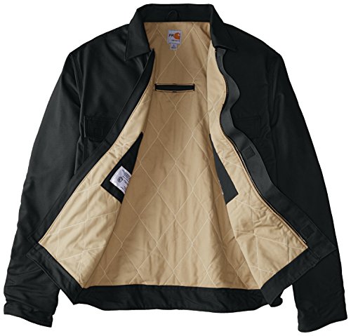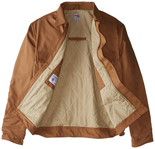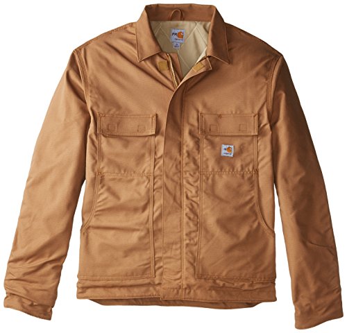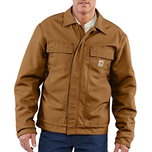 Studio : Carhartt Sportswear - Mens Publisher : Carhartt Sportswear - Mens Binding : Apparel Product Description Carhartt's flame-resistant lanyard access jacket features a fall-protection feature for Carhartt's safety. Made of 8.5-ounce FR canvas, a blend of 88% cotton and 12% high-tenacity nylon, it has a 6.75-ounce FR quilt lining and a flapped back which allows a lanyard to pass through and attach to a safety harness. It features a pleated bi-swing back for ease of movement, two chest pockets with flaps and hook-and-loop closures, two large lower front pockets, two inside patch pockets with FR hook-and-loop closures and inner sleeve Nomex rib-knit storm cuffs. It also has adjustable hook-and-loop cuffs that cinch tight to fit under work gloves, a brass zipper front with Nomex tape plus inside and outside protective flaps with hook-and-loop closures for electric arc protection. Under-collar snaps for optional FR hood (FRA002). NFPA compliant. 8.5-ounce FR canvas, a blend of 88% cotton and 12% high-tenacity nylon Adjustable hook-and-loop cuffs cinch tight to fit under work gloves Flapped back which allows attachment to safety harness 0