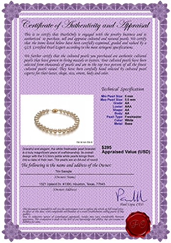 -. Feature : Included FREE with your cultured pearls bracelet is an Appraisal Certificate prepared by a Pearl Expert describing in detail your bracelet size, color and body shape. A color picture of your bracelet is shown on each certificate to ensure carefree insurance claims should those ever arise. It is a wonderful keepsake that shows you truly care. / Create a WOW! Experience with a FREE matching gift box. Our boxes are exclusively designed for PearlsOnly to gently hold your cultured pearl bracelet during shipping and also to be breathtaking when your cultured pearl bracelet is unwrapped and opened. With a focus on detail and elegance, the overall packaging from outside wrapping to inside, creates an unforgettable opening experience. / Easily care for your cultured pearls bracelet, with a FREE silky storage pouch to protect your cultured pearls bracelet when you are not wearing it. Although cultured pearls are very easy to take care off, we do include a FREE Pearl Care Card, so that you can easily know how to best take care of your cultured pearls bracelet to keeps its value and beauty. / We want to be 100% satisfied with your purchase and that is why we offer 30-day returns on all of your purchases. Returns are easy and should you need to return or exchange an item, our customer care team is ready to assist you around the clock. And with a huge selection of Freshwater Cultereed Pearls, Japanese Akoya Cultured Pearls, Saltwater Cultured Pearls, Tahitian Cultured Pearls and SouthSea Cultured Pearls you can find so many things to suit your taste.