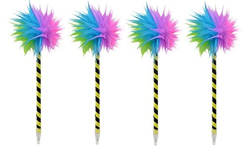 -. Feature : 4 Fun Rainbow Puff Ballpoint Pens / Plastic striped pens are a wild way to take notes! Each features a puff ball topper in a rainbow of colors. / 8.75 inches tall