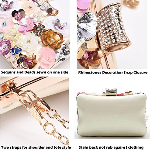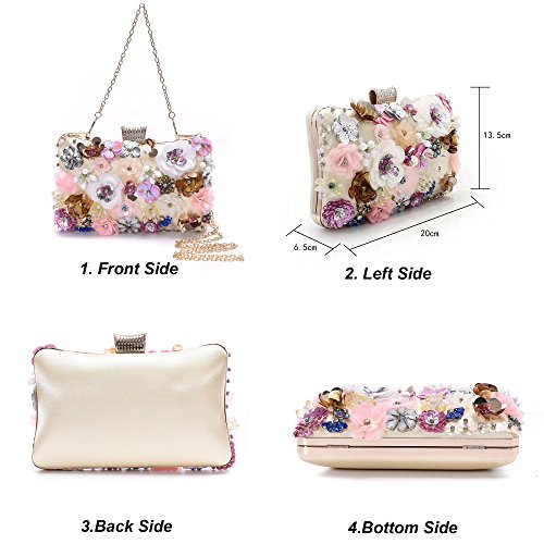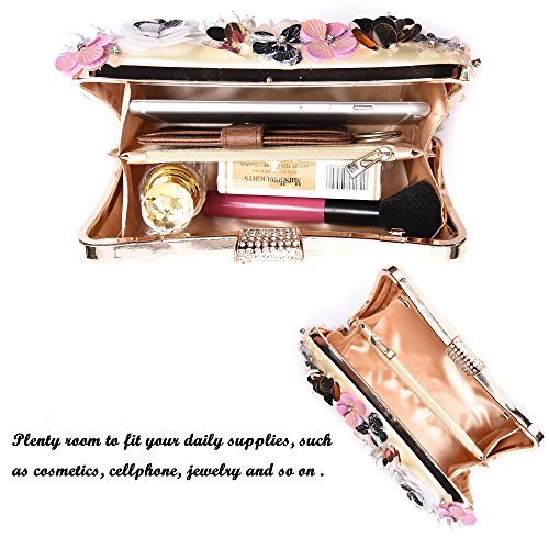 -. Feature : ✔Material :The entire structure is made of superior hardware frame construction, the lining is made from weave, which feels soft and comfortable when you take it. / ✔Size: 7.8 in (L) X 2.6 in (W) X 5.3 in (H) With two straps. The removable chain-strap for you to choose hold it in hand or on the shoulder. The proper chain length also can be a crossbody and shoulder bag. / ✔Large Capacity: The main compartment can fit up 7 Plus well, mirror, a folding hair brush, small bottle of perfume, lipstick, 1 inter zippered pocket for some bills and cards. / ✔Perfect Design: This is a very beautiful and unusual looking bag. It's has sequins and beads sewn on one side. The Back side is satin, so it won't rub against your clothing and ruin them. / ✔Occasion :Stylish, leisurely design can be used as a daily clutch when you're out of the street and have a vocation. Exquisite, elegant design can be used as evening bag when you attempt wedding party, banquet and special party.
