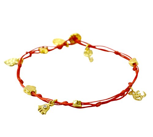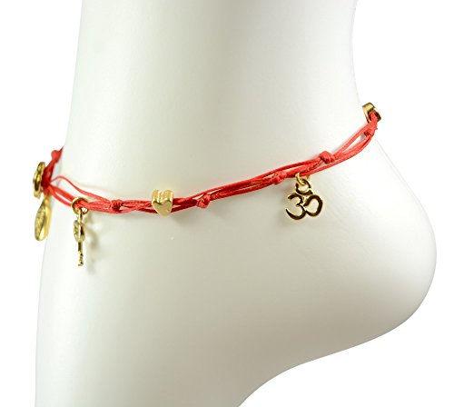 -. Binding : Jewelry -. Brand : MIZZE Made for Luck Jewelry -. Department : womens -. Feature : Beautiful Handmade wax wire anklet in Red / Charms include Hamsa, Hearts, stars and small coins / All charms are 24k gold plated / The anklet is a standard size 11" -. Label : MIZZE Made for Luck Jewelry -. Manufacturer : MIZZE Made for Luck Jewelry -. Model : MZ3000RDG -. ProductGroup : Jewelry -. ProductTypeName : FASHIONNECKLACEBRACELETANKLET -. Publisher : MIZZE Made for Luck Jewelry -. Studio : MIZZE Made for Luck Jewelry -. Title : Red Anklet with Gold Plated Good Luck Charms