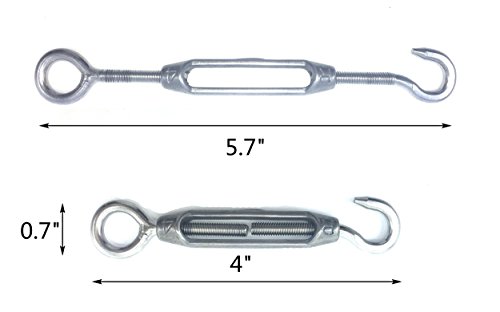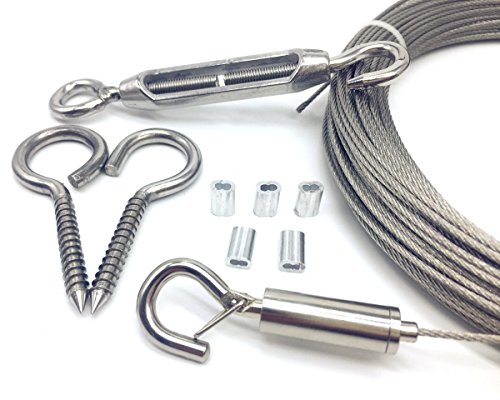 65 feet long; 1/16 inch in diameter comes with 2-Pcs Turnbuckle,5-Pcs Aluminum Crimping Loop Sleeve,2-Pcs Screw Eyes Lag Thread, 1-Pcs Attached Snap Hook