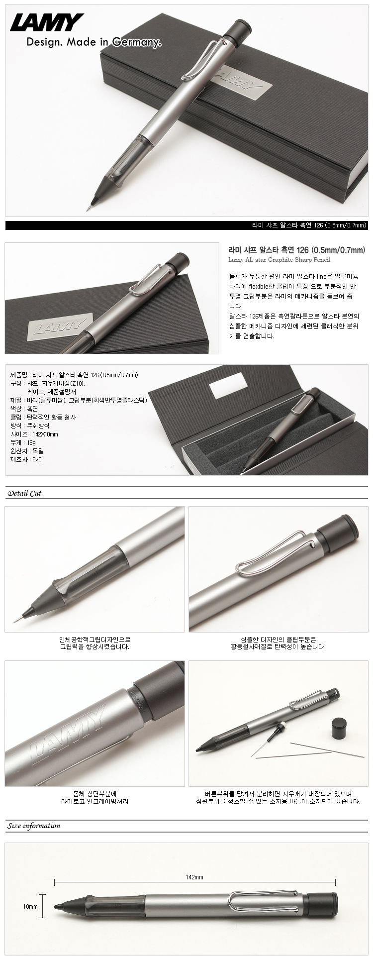 ■ 유의 사항- 제품 구입시 0.5mm 샤프심, 지우개와 소지기가 장착되어 있습니다.- 샤프심은 리필이 가능하며 M41(HB)을 구매하여 사용하시면 적당합니다.소지용 바늘이란? 소지용 바늘은 모든 샤프에 들어있는 것으로,피드부분에 연필심 조각, 흑연 찌꺼기등으로 인한 막힘을청소해 주는 이상적인 도구를 말한다.jh0908 1006jeh
