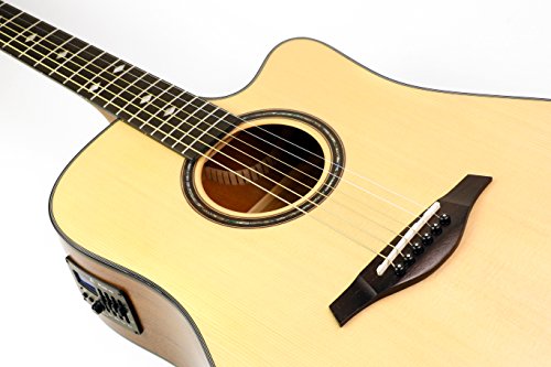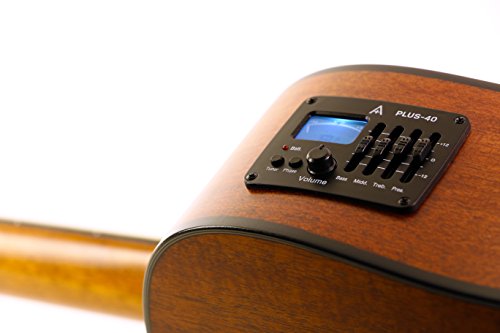 - Feature : A+ advantages including multi-pin neck joint / Solid spruce top, Diamond inlays and inlaid rosette / Gold tuners with satin black pegs / cutaway with A+ 40 pre-amp with 4 band EQ, phase volume and tuner / includes black padded gig bag with pocket