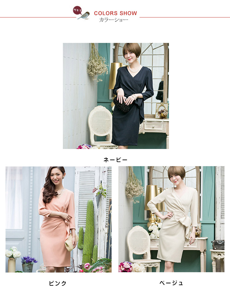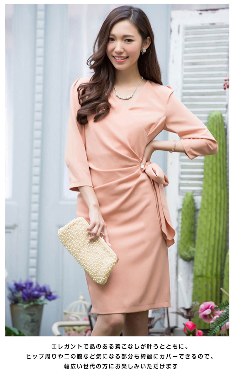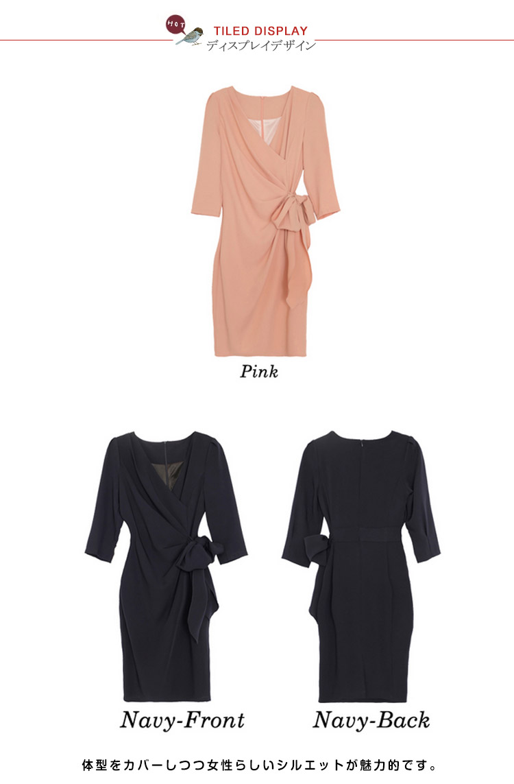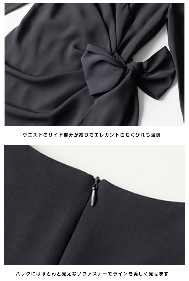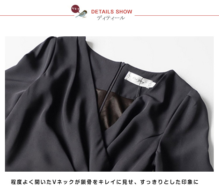 | きちんと感を出しながらも、おしゃれに着こなせる七分袖ワンピースバストからウエスト部分に入ったタックは胸まわり、腰回りをすっきり綺麗見せ気になるお腹周りを自然にカバー。体型をカバーしつつ女性らしいシルエットが魅力的です。エレガントで品のある着こなしが叶うとともに、ヒップ周りや二の腕など気になる部分も綺麗にカバーできるので、幅広い世代の方にお楽しみいただけます | |