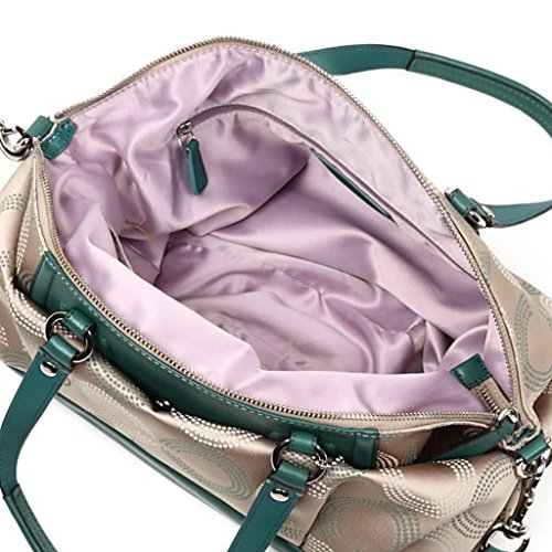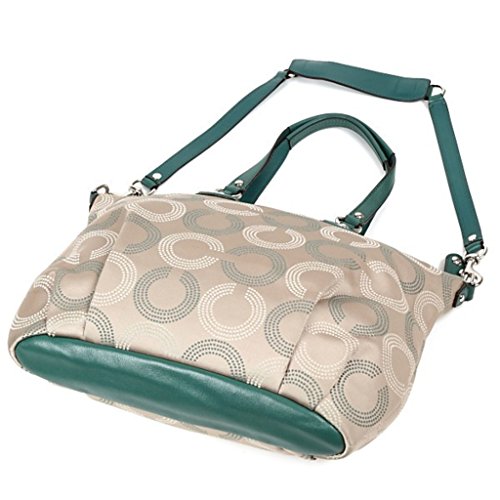 -. Brand : Coach -. ClothingSize : 14.5"L x 14"H x 4"W -. Color : Khaki/Aegean -. Department : womens -. EAN : 0886382791510 -. Feature : Dotted op art print fabric with leather trim / Inside zip, cell phone and multifunction pockets / Zip-top closure, fabric lining / Longer strap for shoulder wear 14" drop / 14 1/2" (L) x 14 1/4" (H) x 4" (W); Double Handles with 6 3/4" drop -. Label : Coach -. Manufacturer : Coach -. MPN : F25183 -. PackageQuantity : 1 -. PartNumber : F25183 -. ProductGroup : Shoes -. ProductTypeName : HANDBAG -. Publisher : Coach -. Size : 14.5"L x 14"H x 4"W -. Studio : Coach -. Title : Coach Ashley Dotted Op Art North/south Satchel Shoulder Bag 25183 Khaki Aegean -. UPC : 886382791510 COACH is an American leather goods company known for ladies' and men's handbags, as well as items such as luggage, briefcases, wallets and other accessories. COACH is one of the most well-known brands in the world. Both men and women recognize the COACH logo and millions continue to support COACH bags season after season. Established in 1941 as a family run workshop in Manhattan, COACH quickly became renowned not only for their style but also quality.