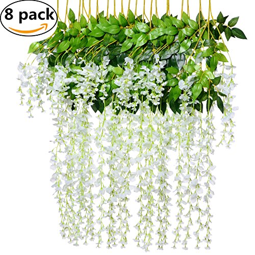 8pcs Artificial Fake Wisteria Vine Garland-GreenDec 3.6Ft/Piece Silk Wisteria Vine Ratta Hanging Flower for Home Garden Wedding Decor,(White)