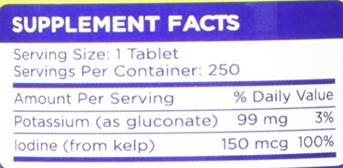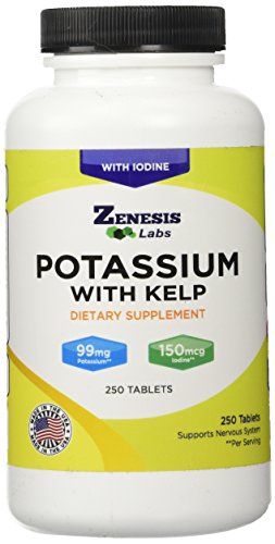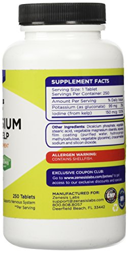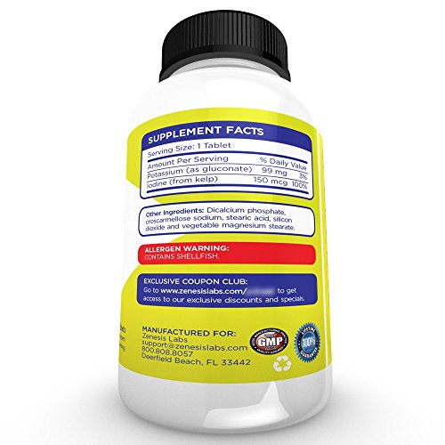 -. Binding : Health and Beauty -. Brand : Zenesis Labs -. EAN : 0634041896928 -. Feature : STOP LEG CRAMPS - Keep the Charlie Horses and cramps away with our high quality Potassium supplement. / SLEEP SOUNDLY AT NIGHT - Calm down the cramps and muscles, and find peace when you sleep. / BLOOD PRESSURE SUPPORT - Helps control blood pressure by balancing the effects of sodium. / WITH IODINE - 100% of RDV from iodine-rich kelp to maintain healthy thyroid function. / 110% LIFETIME GUARANTEE - You won't find a better guarantee anywhere else. Our guarantee is simple: you are protected FOR LIFE. If for any reason or no reason whatsoever you are dissatisfied with this product, let us know and we will give you 100% of your purchase price back no questions asked. Furthermore, we'll even donate 10% to charity. Yes: we believe in our product so much that we can offer you this insane guarantee. -. Label : Zenesis Labs -. Manufacturer : Zenesis Labs -. ProductGroup : Health and Beauty -. ProductTypeName : HEALTH_PERSONAL_CARE -. Publisher : Zenesis Labs -. Studio : Zenesis Labs -. Title : Potassium Gluconate with Iodine Kelp - 250 Tablets - 99mg Per Tablet with 150mcg of Iodine - Blood Pressure Support Supplement - Leg & Muscle Cramp Relief -. UPC : 634041896928
