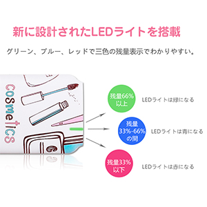 • 新に設計されたLEDライトを搭載して、色で残量表示を実現します!グリー、ブルー、レッドで三色の残量表示でわかりやすい。