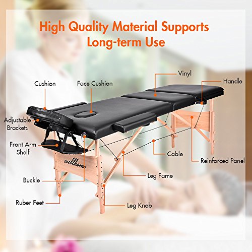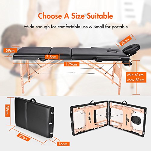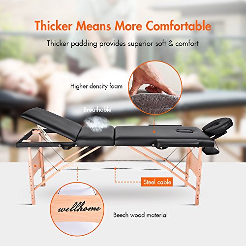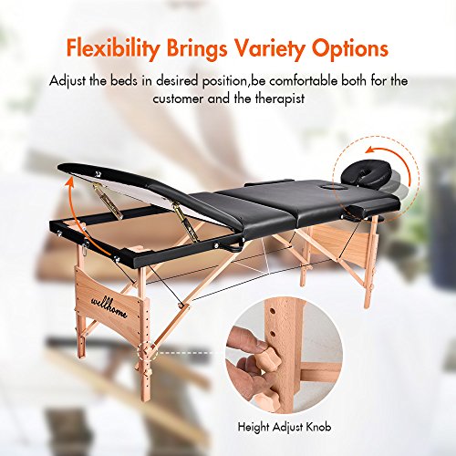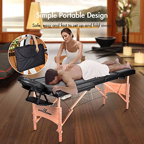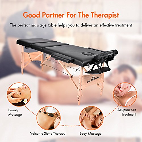 Massage Table-WELLHOME Wood Treatment Table 3 Section Professional Portable Home Folding Facial SPA Tattoo Bed Black, Load up to 660 lbs,82" ×...