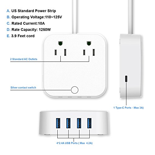 USB Extension Cord - Surge Protector Power Strip, Type-C Charging Port (5V/3A) & 4 USB Ports (5V/2.4A), Portable Travel Charger Station for iPhone iPad Samsung Galaxy & Tablets, USB C Not for Laptops