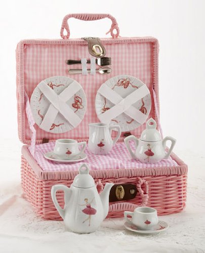 Enjoy a fantasy tea party with this adorable Pink Ballerina design porcelain tea and cake set for two. This whimsical miniature tea set features a teapot with lid, a sugar bowl with lid, 1 creamer, 2 tea cups, 2 saucers, 2 cake plates, 2 spoons, 2 forks, and a pink gingham lined wicker style basket. Basket measures 9.75 X 7.25 inches.