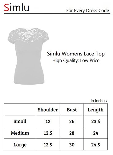 Product DescriptionShort Sleeve Lace Scalloped TopMeasurements:Small:Bust - 30", Length - 24"Medium:Bust - 32", Length - 24.5"Large:Bust - 34", Length - 25"0