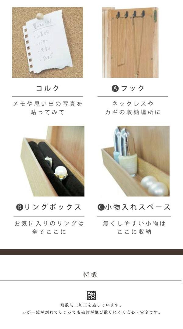 | メモや思い出の写真などを貼ることができるコルクの扉の中がミラーになっています。フックやリング差し、小物入れも付いていて便利!!省スペースに取り付けられるウォールタイプです。 |