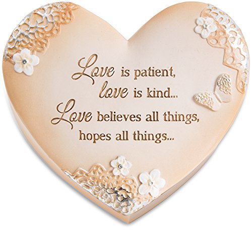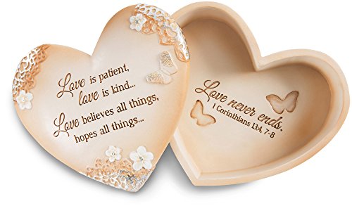 -. Feature : Lid reads - Love is patient, love is kind . love believe all things, hopes all things / Inside reads - Love never ends. 1 Corinthians 13:4, 7-8 / Resin keepsake box intended to hold small trinkets, jewelry, etc / Packaged in an attractive Gift-to-Go box