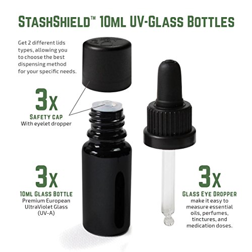 STASHSHIELD 10ML BOTTLES - The StashShield distinguishes itself by its high quality and offers optimal protection against the harmful effects of light. Volume Capacity: 10ml