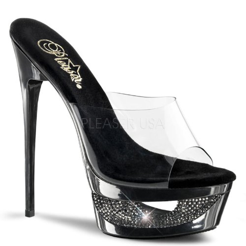 Product DescriptionFeatures. 1.75 in. Cut-Out Platform Slide Shoe.. 6.5 in. Heel.. Color - Black Clear.. Size - 8.0