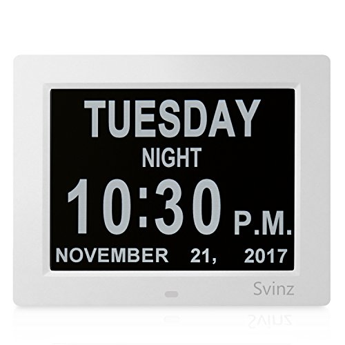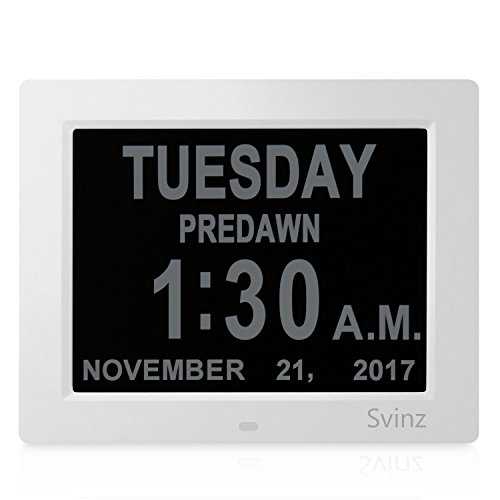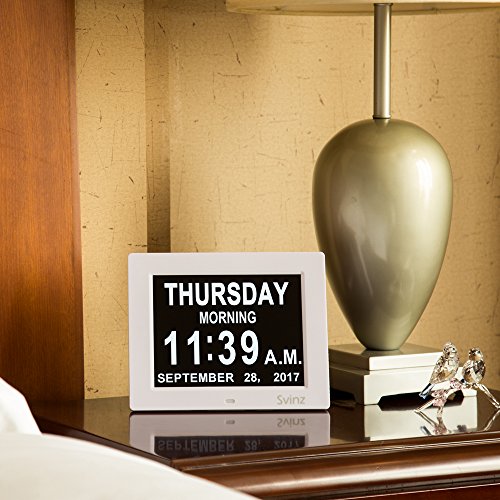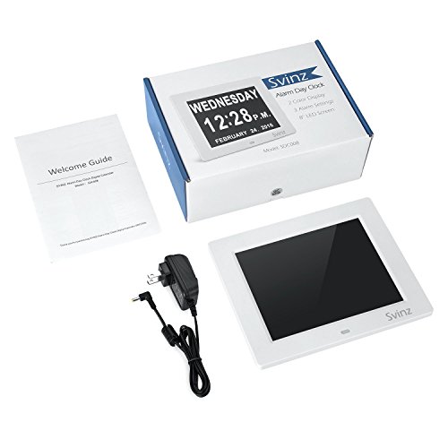 • UL Certificated AC adaptor Whether you're looking for the right day clock for an aging loved one or are teaching schoolchildren how to read the time and date, our uniquely designed digital alarm day clock is the only one you'll ever need. Aging people faced with Alzheimer's, memory loss and dementia need structure, routine and focus. They often lose the ability to recognize what day of the week it is. Traditional digital clocks have abbreviations, which can be confusing. To prevent this, the day clock by Svinz has a clear and easy to read screen which helps reduce anxiety about the time of day and ease the worry of missing an appointment, mealtime, or any other key event. Features - Stand alone 8" digital calendar clock - Wall hanging or pull-out stand self standing - Character heights: Day: 1", Time: 1. 1/2" , Date: 1/2". - 8" LED screen (175mm) diagonal - 5.55" wide x 4.2" high - 100+ Year Automatic Calendar - Months & Years - Dual Time Mode - 12 or 24 Hour. - Dual Date Mode - DD/MM/YYYY or MM/DD/YYYY. - 8 Languages Built-in. - Auto Night Dimmer - 7 p.m. [19:00hrs] to 7 a.m. [07:00 hrs] - Silent in operation - Fully automatic calendar changes including Leap Years. - Auto Built-in "On-OFF" Memory Settings - Power Adapter - 100-250V AC - Output DC 5Volt 1amp. What you get: Svinz SDC008 Alarm Day Clock, AC Adapter, Welcome Guide, Worry-free 12-month Warranty.
