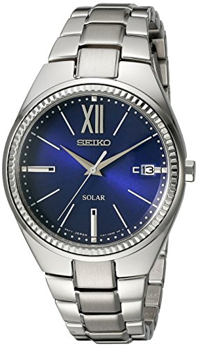 Stainless steel case with a stainless steel bracelet. Fixed stainless steel bezel. Blue dial with silver-tone hands and index hour markers. Roman numeral appears at the 12 o'clock position. minute markers around the outer rim. Dial Type: Analog. Date display at the 3 o'clock position. Solar quartz movement. Scratch resistant hardlex crystal. Pull / push crown. Solid case back. Case diameter: 36 mm. Case thickness: 10 mm. Round case shape. Band width: 20 mm. Deployment with push button release clasp. Water resistant at 30 meters / 100 feet. Functions: date, hour, minute, second. Casual watch style. Seiko Solar Recraft Blue Dial Stainless Steel Ladies Watch SNE879.Feature