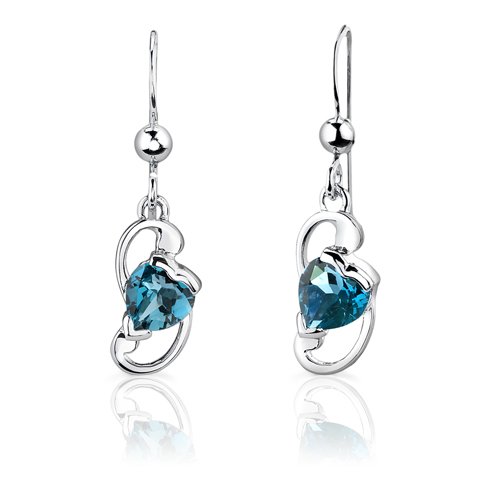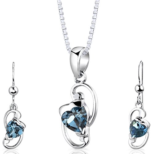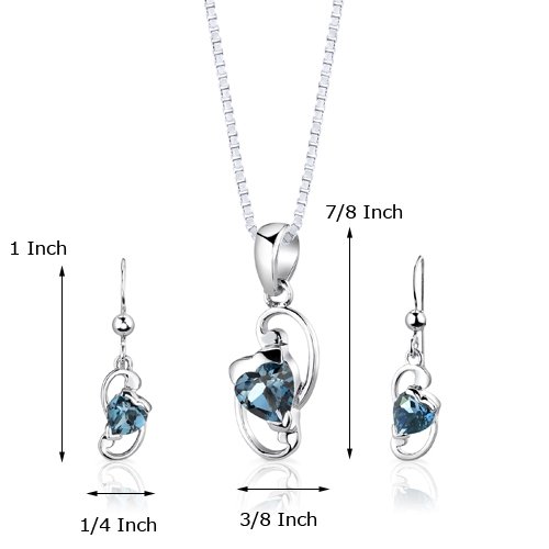 Earrings = Genuine London Blue Topaz, 2 pieces, Heart shape, 5.00mm. Earring Dimensions: 1 x 1/4 inch. Pendant = Genuine London Blue Topaz, 1 piece, Heart shape, 6.00mm. Pendant Dimensions: 7/8 x 3/8 inches. Earrings and Pendant have a total weight of 3.30 grams and are set in pure Sterling Silver Rhodium Nickel Finish with .925 stamp. Gemstones have a vibrant rich color and eye clean clarity. The Pendant and Earrings feature top quality workmanship and a beautiful finish. Includes Free 18 inch Sterling Silver Rhodium Nickel Finish Box Style Chain, Free Ribbon Gift Box.Feature
