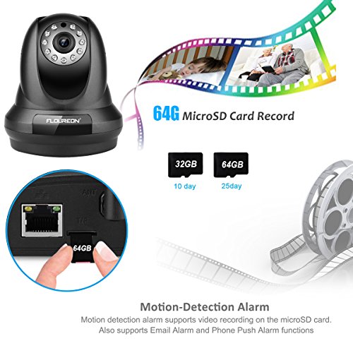 - 【IR Day & Night Vision】: 11 pcs IR leds with night vision up to 20 feet. IR LED illumination for night vision is automatic. Support P2P (point to point) technology, the IP Cam can be linked through the internet without any complicated port mapping. Keep your house, store, business in security with the range of 355 degree horizontally and 90 degree vertically.