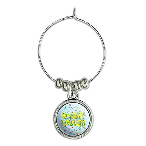 -. Brand : Graphics and More -. Feature : Unique and functional super awesome drinking glass charm / Includes the resin encased design on both sides of the 15mm metal charm / Approximate size of charm is 15mm / Sold individually / Created by Graphics and More in the USA -. Label : Graphics and More -. Manufacturer : Graphics and More -. ProductGroup : Kitchen -. ProductTypeName : KITCHEN -. Publisher : Graphics and More -. Studio : Graphics and More -. Title : Wine Glass Charm Drink Marker Graduation Graduating Class of