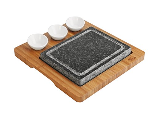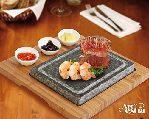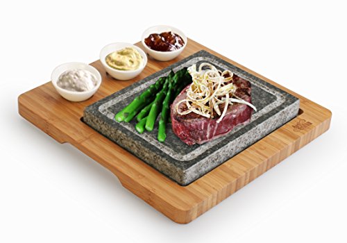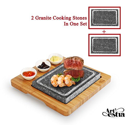 ★ Barbecue Sizzling Hot Stone Set for Tabletop Grill by Artestia ★ Grill like professional chef! You control exactly how the steak is cooked at your table to enjoy a healthy, tasty flavorful meal ★ Put the stone in a COLD oven and heat it for 40 to 60 minutes with 500 °F ( or put the stone on a stovetop, turn up the heat gradually, use heat sensor gun to check its temperature), take it out when it stays at 500 °F (always use oven glove to serve hot stone to avoid being burned! ) and put it on the bamboo tray. The stone remains effectively hot to grill your food for about 15 to 25 minutes. ★ Place lightly grilled or raw steak on the stone and searing each side for about 30 seconds, Then, you slice off one piece, lay it down flat onto the stone to grill one side for a few seconds, flip to the other side for a few more seconds and enjoy perfectly cooked steak as exactly to your liking. Do that bite after bite, cooking each bite just before eating it, all the way though the entire steak. You effectively control how well each slice is cooked before eating it, it remains hot in perfect tasting. No more guessing how well the steak should be cooked before serving it. No more ruining your appetite eating cold steak. ★ Very easy to clean and maintain, simply wash with water and dish soap after stone drops down to room temperature, wipe out water and let it air dry ★ Two food grade grill stones (L 8.4" x W 6.5" x D 1") made of high density granite stone that can preserve heat better, one bamboo platter with stainless steel tray, three ceramic side sauce bowls food in picture for demonstration only, not include in the package 0 |