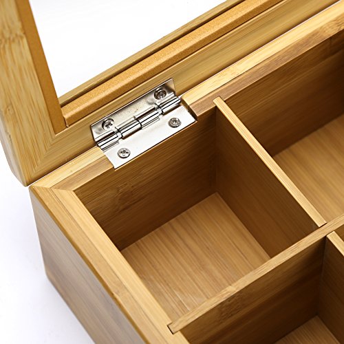 Specifications: Material: bamboo glass lid Storage compartments: 9 Size: 23x23x9cm/9.2x9.2x3.6in(LxWxH) Weight: 1000g Package included: 1* Tea Storage Chest Box