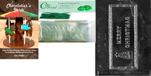 Cybrtrayd Merry Christmas Card Chocolate Mold with Chocolatier's Bundle of 25 Cello Bags, 25 Green Twist Ties and Chocolatier's Guide