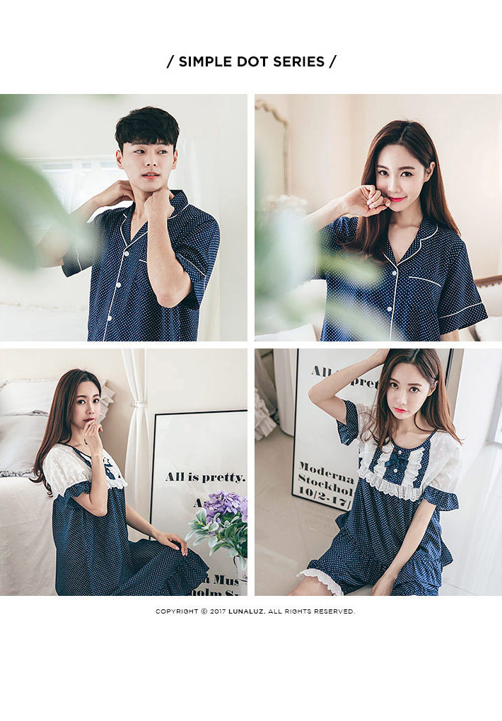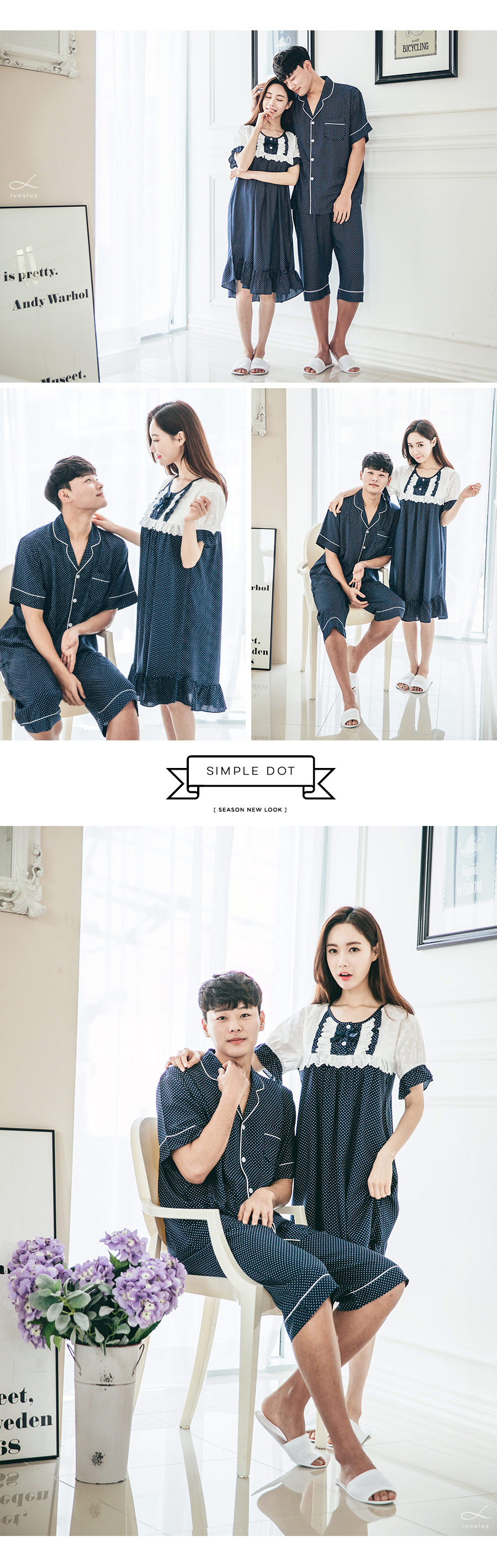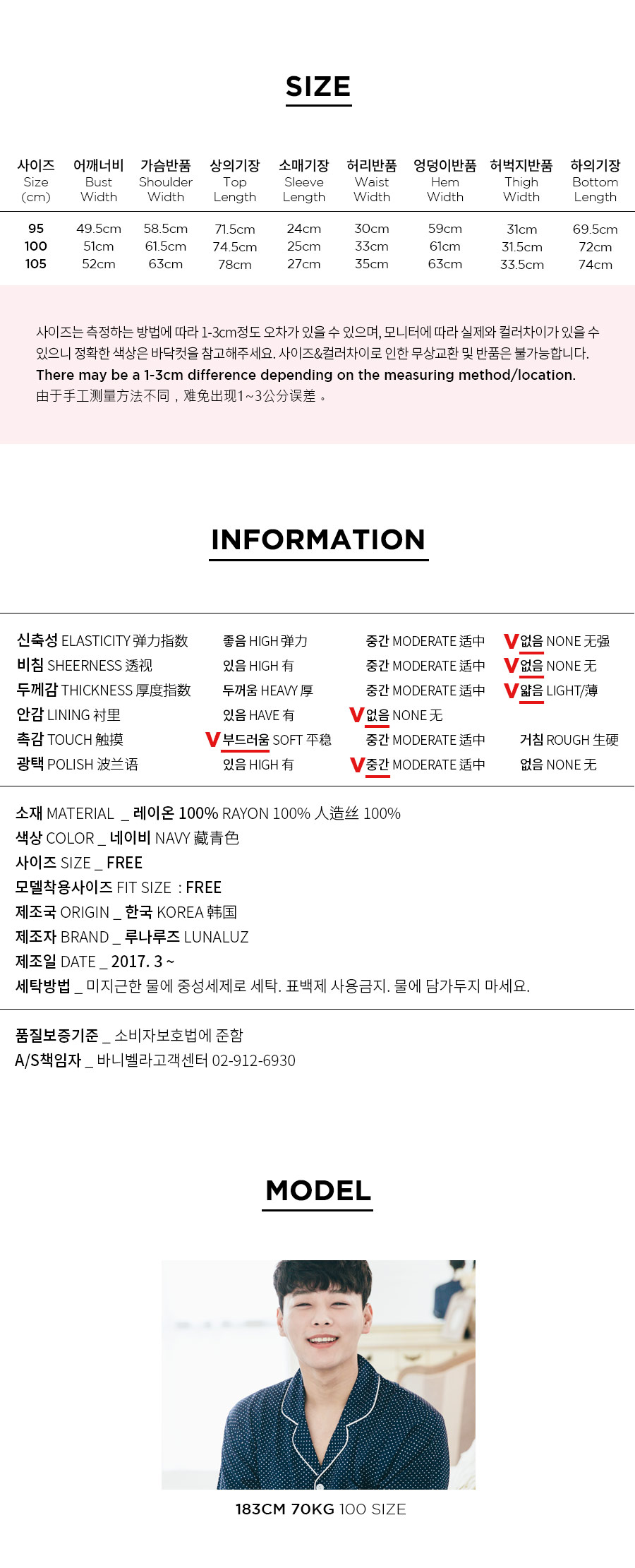 동일한 원단, 동일한 디자인으로 입으면 더 스타일리쉬한 무드를 취할 수 있는 커플 잠옷으로 강력 추천해 드리고 싶어요^^ 단정하고, 심플한 느낌이 매력적인 커플 잠옷인데요. 심플하고 young한 분위기를 연출해주는 잠옷으로 전 연령 모든 분이 착용하셔도 정말 잘 어울리는 스타일이랍니다. 파이핑으로 깔끔하게 포인트를 주어 세련되고, 편안한 분위기가 감도는데요. 드레이프성이 좋은 레이온 소재로 착용감이 굉장히 좋고, 체형을 좀 더 슬림 하게 보완해줍니다. 실키한 느낌과 상쾌한 느낌에 더 만족해 하실 거에요. 흐늘거리는 원단에 꼼꼼한 파이핑 봉제 작업이 들어간 잠옷으로 퀄리티 높은 공정이 들어간 잠옷입니다. 포켓을 달아주어 포인트를 주었습니다. 시원하고 상쾌한 느낌이 도는 레이온 소재는 더운 여름 상쾌하고 산뜻하게 입기 좋습니다. 소재가 굉장히 실키 하여 피부에 닿는 느낌이 좋고, 피부가 민감하신 고객님들에겐 더 추천하고 싶은 잠옷입니다. 100%국내 제작으로 소재가 좋고, 봉제선이 깔끔하며 디자인에 퀄리티를 높여 주었습니다. 여성잠옷은 free사이즈로 평소 44반~66size까지 입으실 수 있는 패턴입니다.