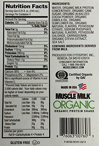 -. Title : Genuine Muscle Milk Organic Protein Shake Chocolate Gluten Free 4-8.25 Oz Cartons