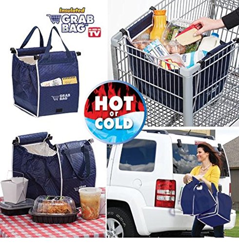Insulated grab bag Stop using annoying plastic shopping bags that rip, and use this reusable insulated grocery bag. The bag expands to hold up to 40 lbs of groceries, while the insulated lining keeps food hot or cold. The bag clips onto the sides of the shopping cart, so you can quickly and easily add items. Feature a velcro closure, as well an outer pocket that's perfect for wallets, coupons, and recipes. Folds flat for easy storage. Perfect for grocery shopping, picnicking, and traveling. Mold and mildew resistant. Nylon