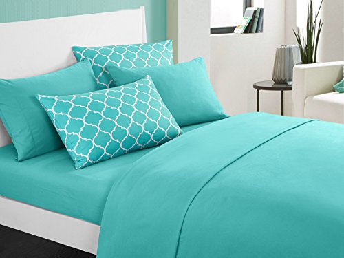 Chic Home Illusion 6 Piece Sheet Set Super Soft Solid Color Deep Pocket Design - Includes Flat & Fitted Sheets and Bonus Printed Geometric Pattern Pillowcases, Queen Turquoise