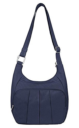 The Travelon Anti-Theft Classic Pleated Front Hobo combines style and function in an attractive security-conscious bag. Security never looked so good. The adjustable strap allows you to wear over the shoulder or as a crossbody bag. It can easily hold an iPad or tablet. The front compartment has a zip pocket plus an organizer with RFID blocking card and passport slots. The slash-resistant strap can be attached to a stationary object to prevent a grab-n-go. The front and rear slash pockets are perfect for frequently needed items. Two mesh expansion pockets are ideal for a water bottle, umbrella or sunglasses. Comes in Black, Purple, Cranberry, Midnight or Stone.Feature