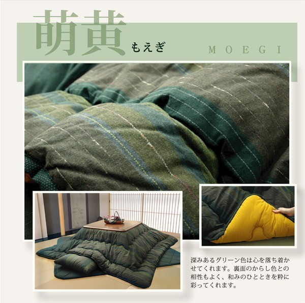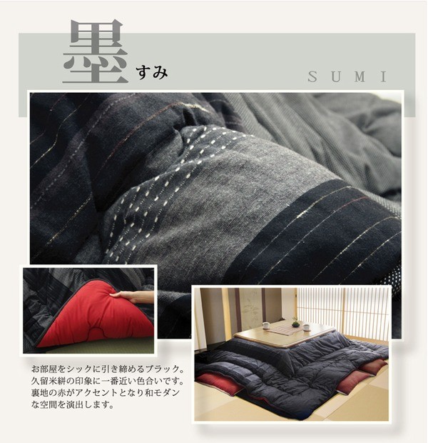 久留米織を使用したこたつ布団です。両面に使用することにより和モダンに仕上げました。味のある和モダンな色味が特徴です。部分暖房のこたつは電気代もお得です。
