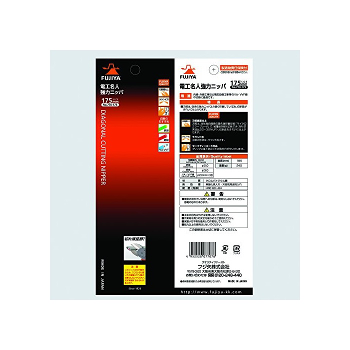 원본상품명:フジ矢 電工名人力ニッパ (VA線切) 175mm 刃部鏡面仕上げで切れ味群 770-175